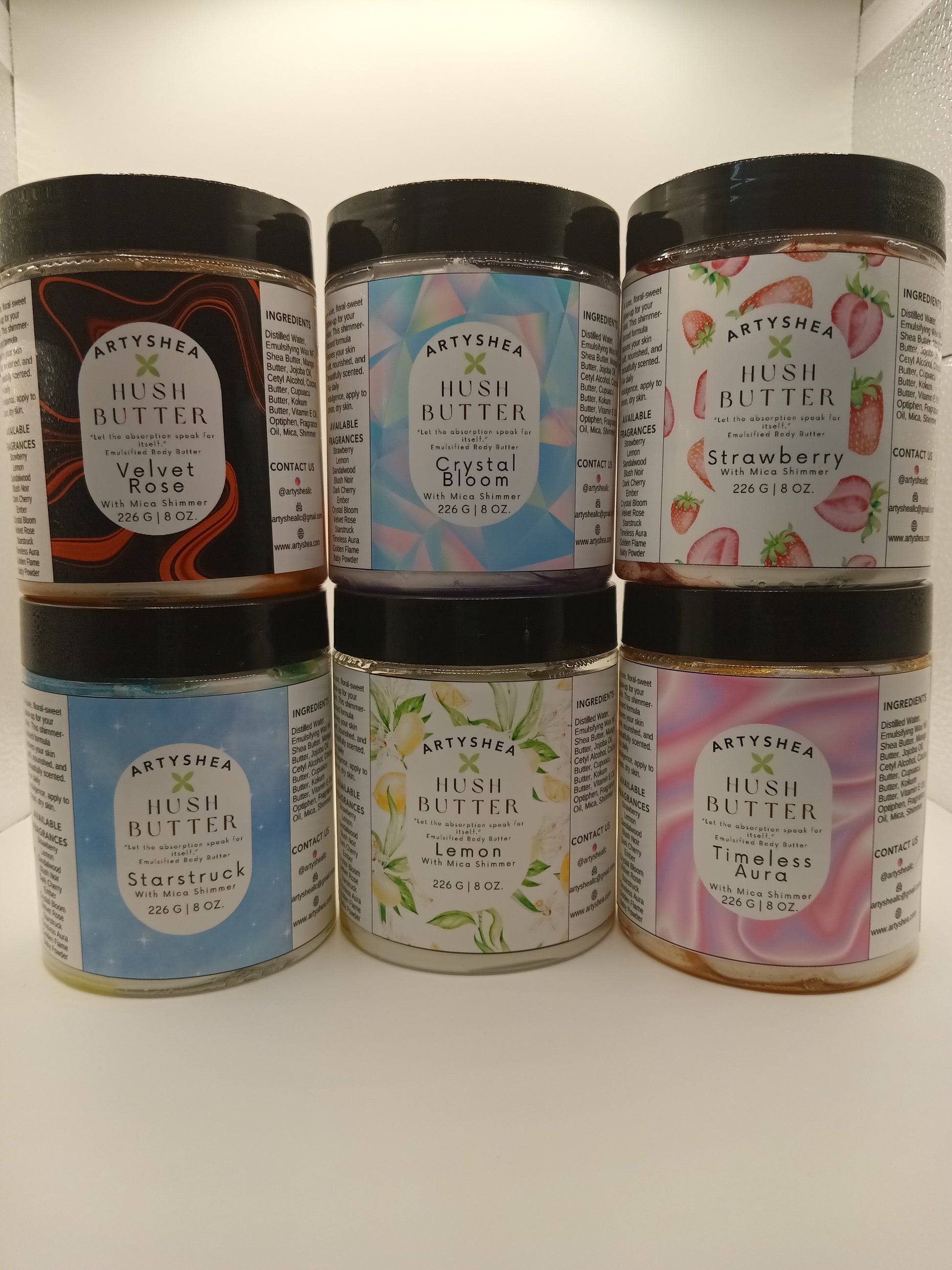 Nourish your skin with our Hush Butter, a luxurious blend of Shea, Cocoa, Mango, Kokum, and Cupuacu butters whipped with Jojoba oil. Infused with Vitamin E, a hint of fragrance, and a subtle shimmer, this butter melts into your skin for lasting hydration and glow.